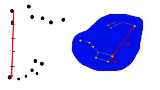 De la Grande Ourse, il est possible de trouver l'étoile polaire, il faut prendre approximativement la distance entre Mérak et Dubhe et la multiplier par cinq dans la direction Mérak-Dudhe , cela donne la position de l'étoile polaire. |